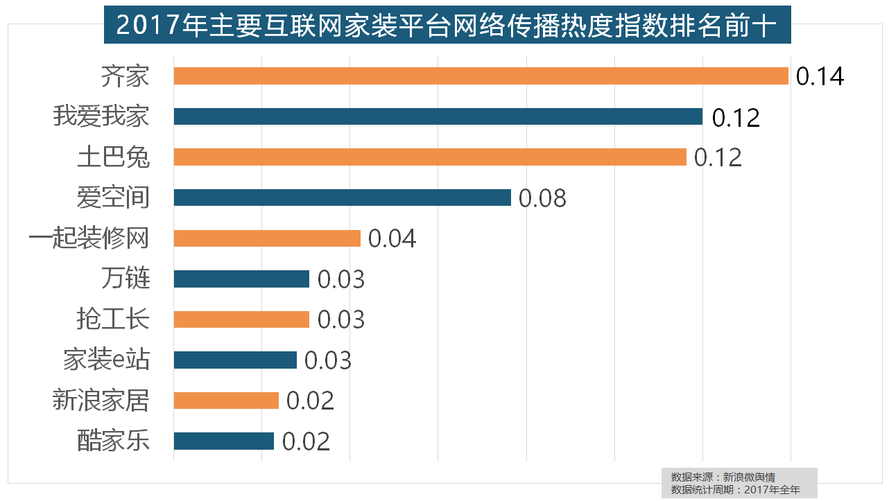 2017年,齐家、我爱我家、土巴兔、爱空间、一路拆修网的收集热度指数排名前五,收集热度指数和全网消息量同比大幅增加。占领第六到第十位。